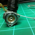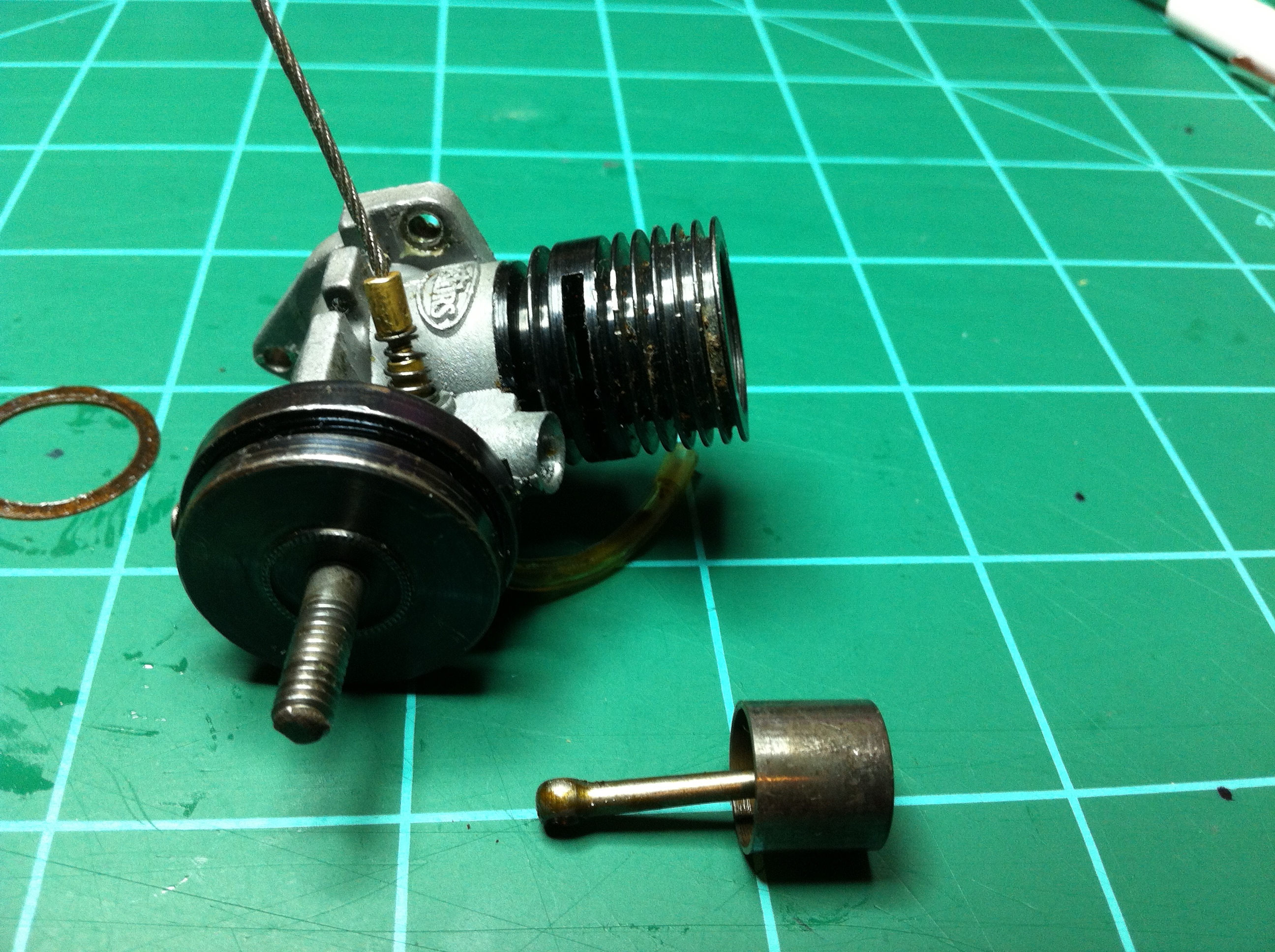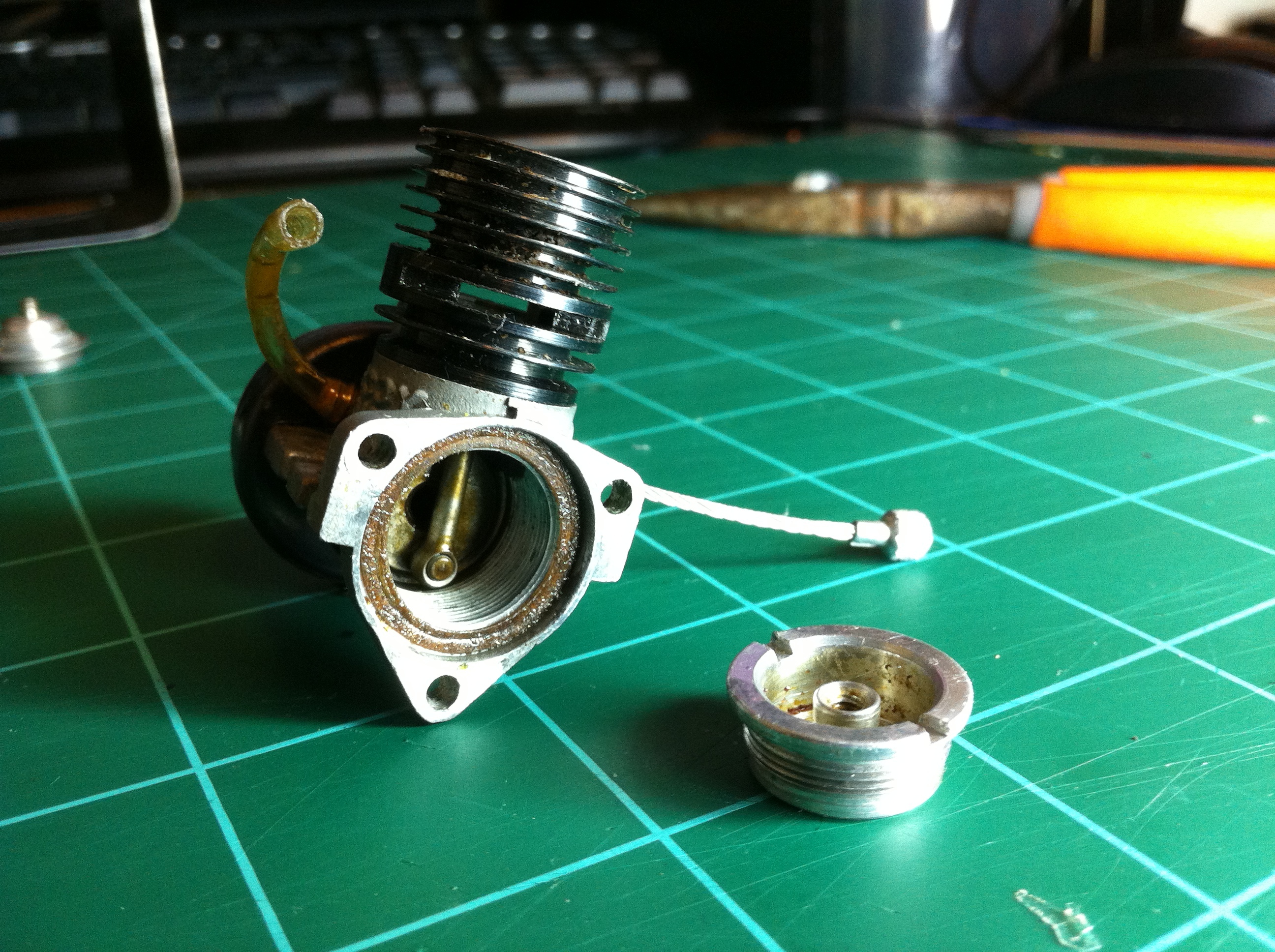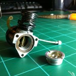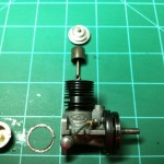 I googled how to dismantle the engine and the best way to clean it but I couldn’t find too much. To help free up the shaft and get a lot of the gummed up old fuel out of it, I decided to soak the engine in carburetor cleaner. I was able to get the glo-plug off of the top of the engine with a pair of pliers – This let the carb-cleaner get down into the engine itself. I let the engine soak for about 6 hours. After I took it out and dried up all of the carb-cleaner, I was able to spin the shaft 360 degrees. It wasn’t very smooth, but it spun. I then found a piece of aluminum 1/16″ x 3/4″ and I used that to unscrew the cap on the back of the engine. After that I took the piston out. To do this I took a very small pair of pliers and pulled the piston connection rod off of the crankshaft. Then I pushed the piston rod up and pulled the piston out through the hole where the glo-plug screws in.
