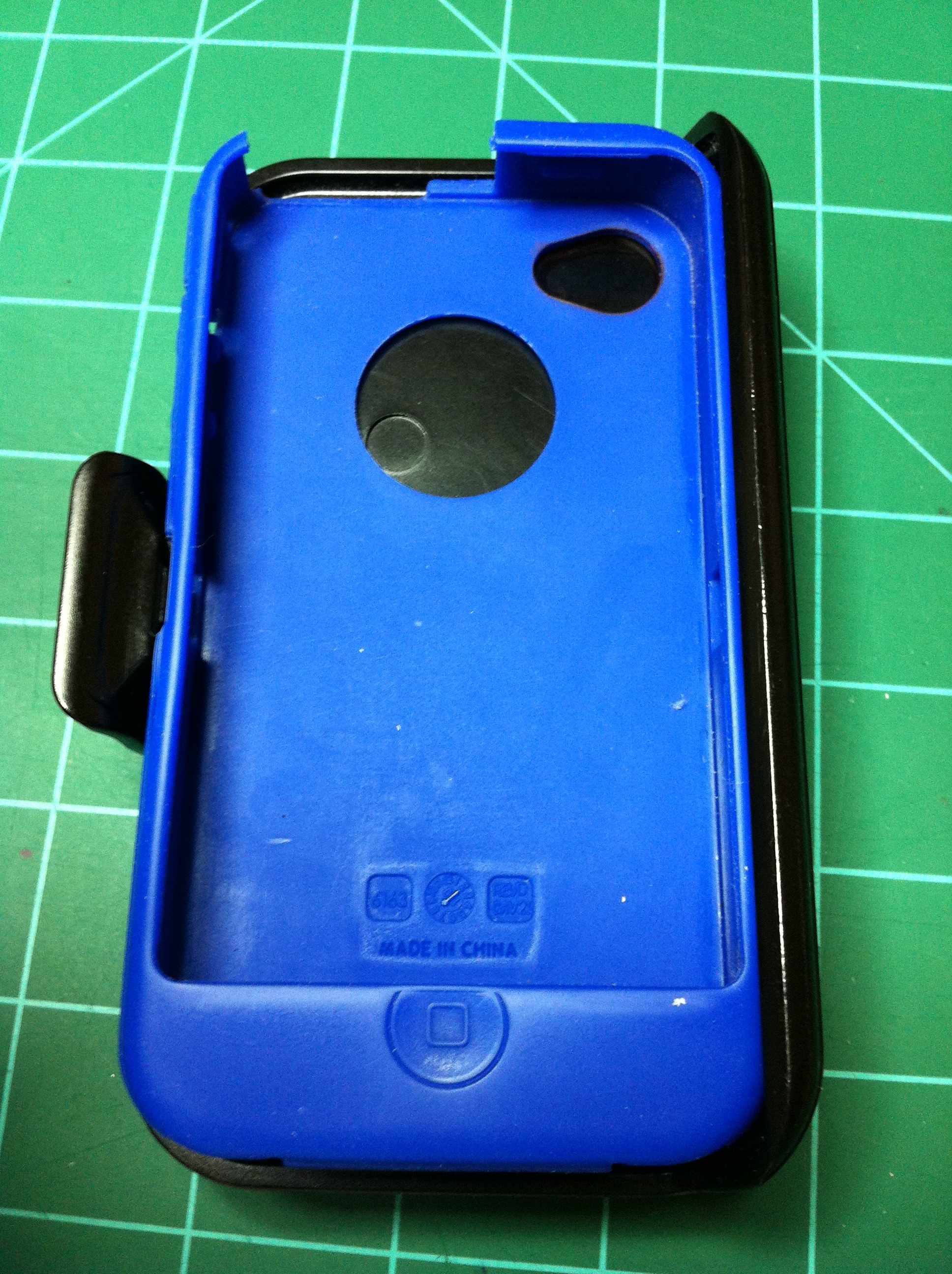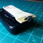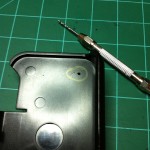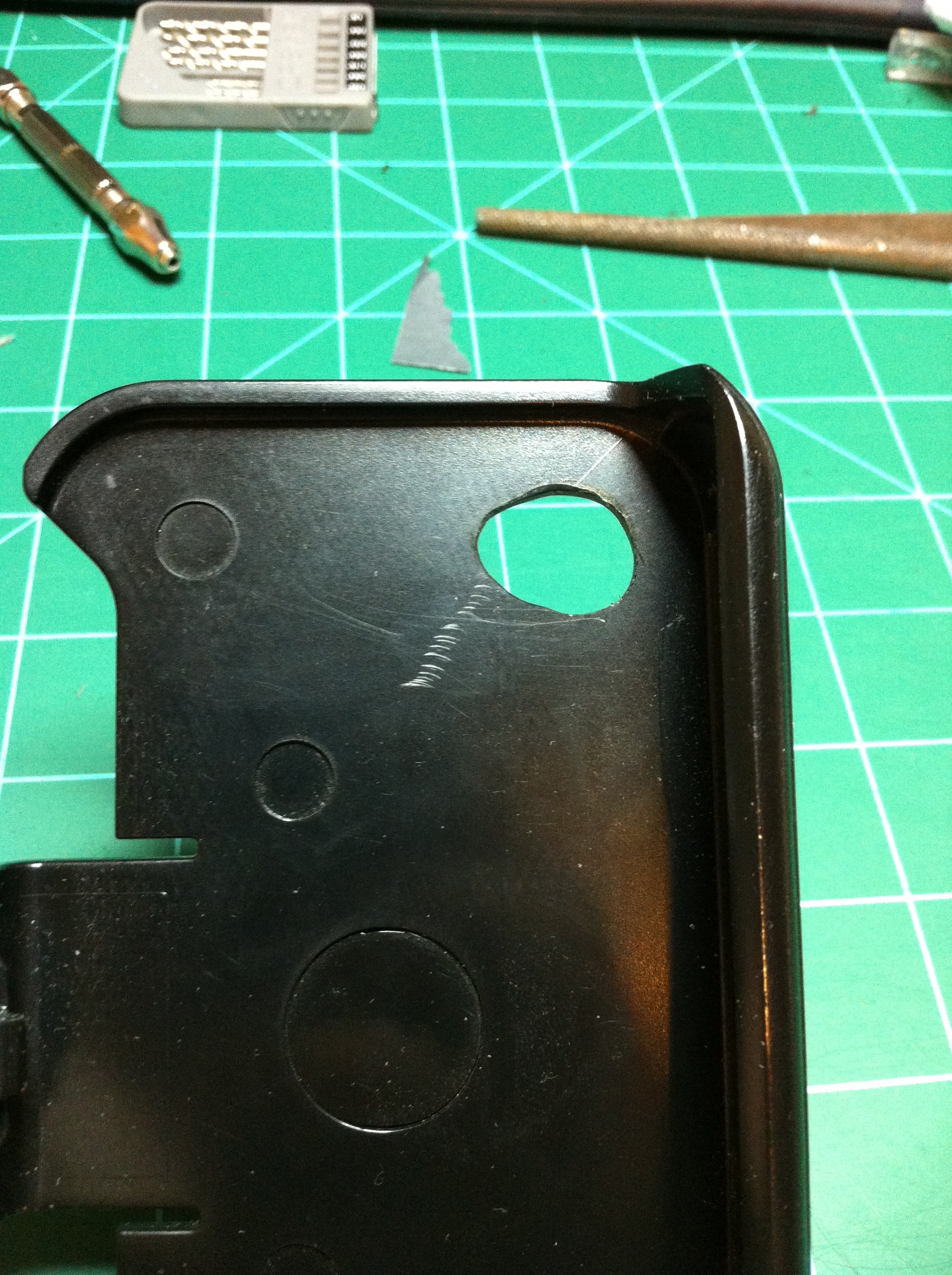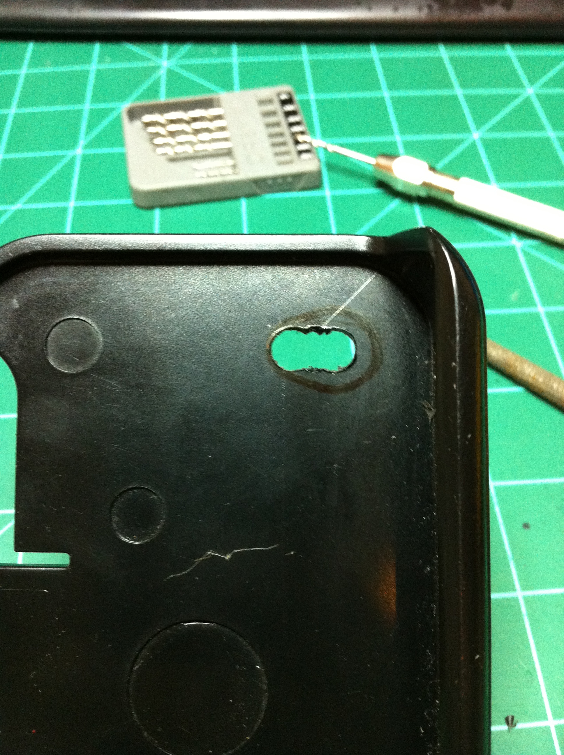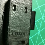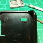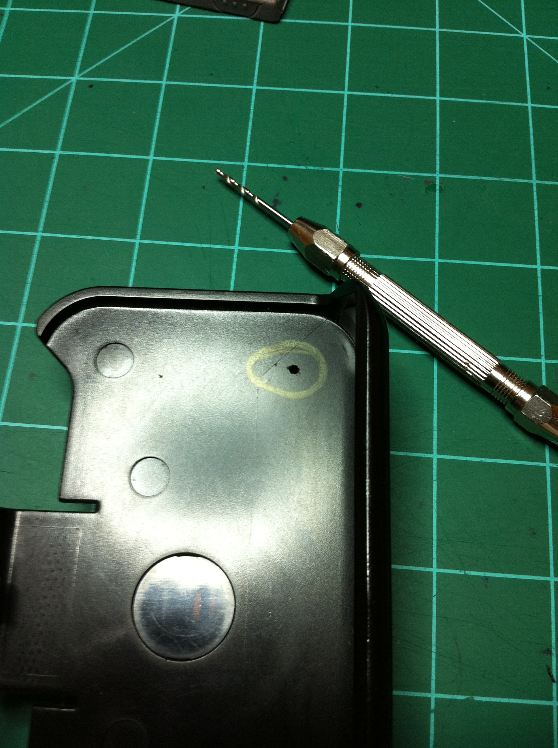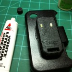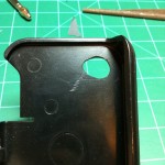 As I was sitting at my desk I was thinking how to go about building this tripod mount for my iPhone when I realized I could use the Otterbox belt clip. I use an Otterbox on my iPhone but I have never used the belt clip, nor do I ever plan on using it (at least for it’s intended purpose, that is). So the first thing I did was take the rubber off of my iPhone case and put it in the belt clip so I could mark onto the belt holster where the camera lens and flash are located. Using a pin vice, I drilled a small hole in the center of the mark where the camera lens is located to help guide the bigger drillbit I will use later. I then used a 1/4″ bit and a cordless drill to drill two holes in the camera lens mark. I wanted to get rid of all the plastic within this mark, but since I didn’t have a larger sized drill bit easily accessible, I used some rat-tail files to finish shaping the hole. I had to snap my iPhone into the clip when I got close to being done to check that there was no plastic in the way of the camera. When I got the hole to the right size, I used some 400 grit sandpaper to make it very smooth.