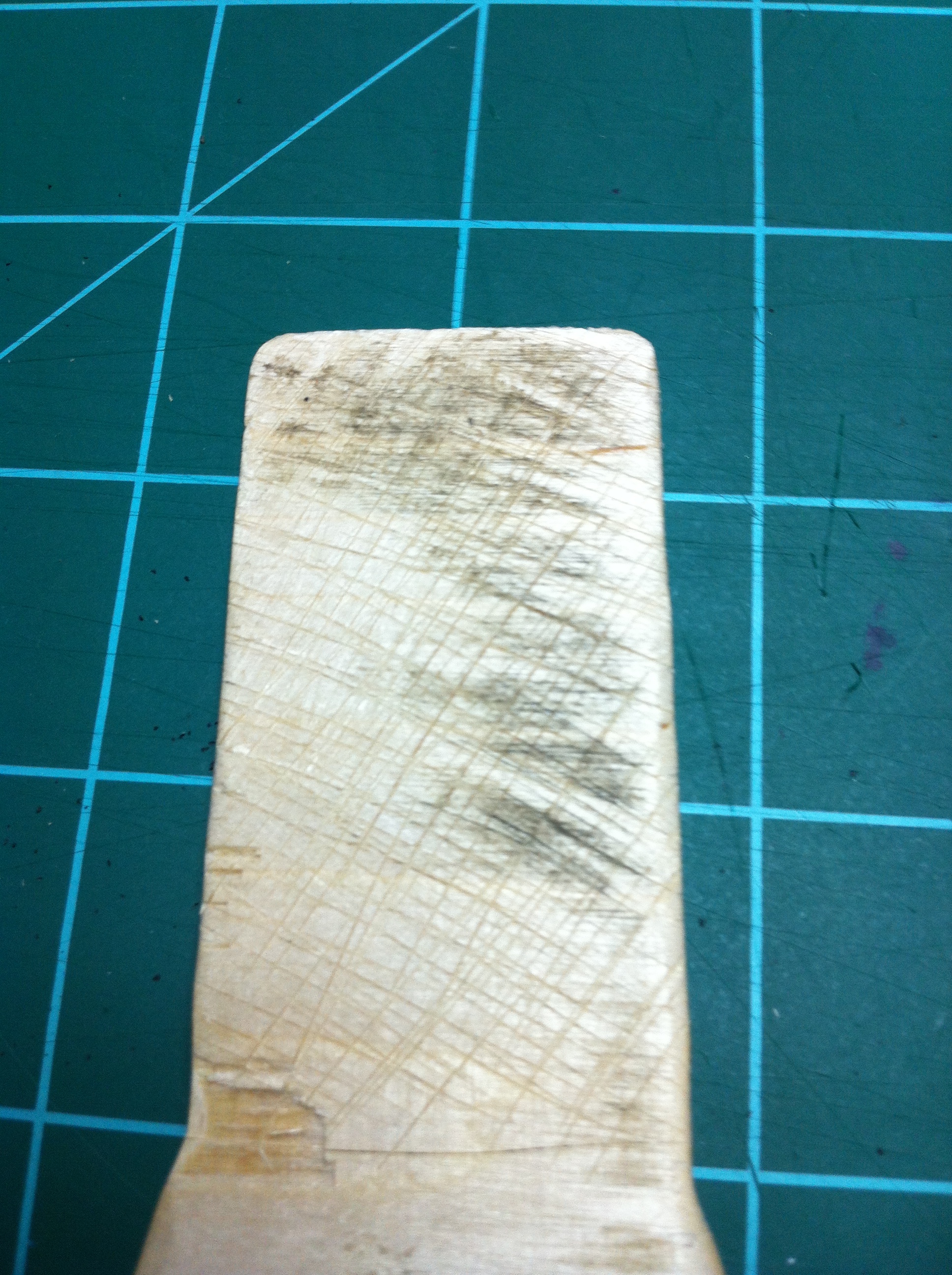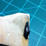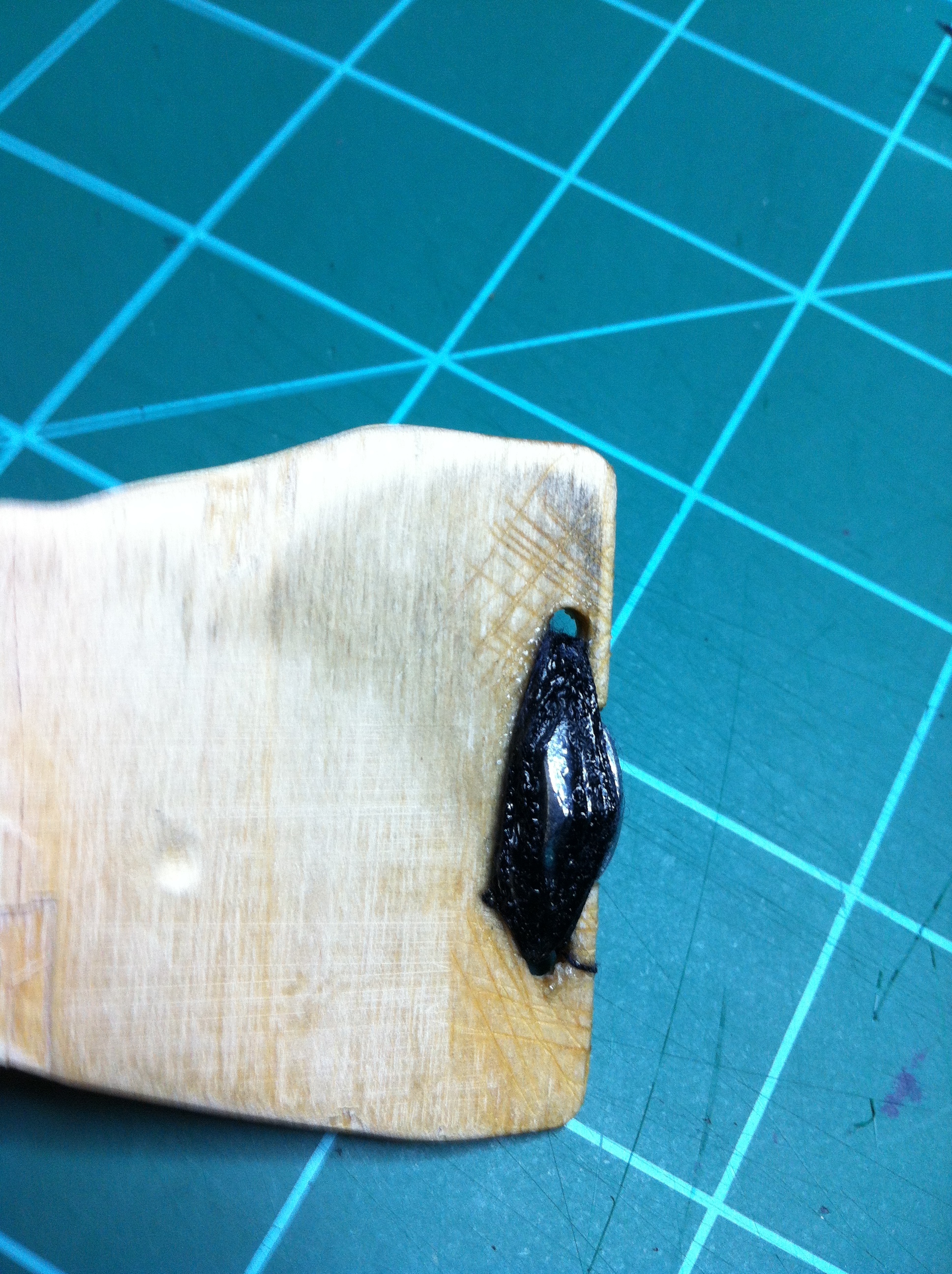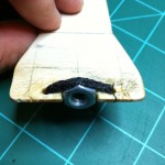 After finishing the hole, it was time to figure out a way to actually mount the thing to a tripod. My first inclination was to get rid of the actual clip part of the holster and maybe glue a 1/4-20 nut onto the back of the holster. –For the record, the standard tripod mounting bolt size is 1/4-20 — I then thought, “Hey, I could somehow mount the nut to the clip! That way I can take advantage of the fact that the clip rotates, which means I can mount my iPhone to a tripod in either portrait, or landscape!”. That is exactly what I did. I took a piece of 1/8″ plywood, cut it at 4″ long, 1-1/4″ wide, and near the bottom I had it flare out to 1-3/4″ wide. I had it flare for extra strength and I thought it looked nicer. I then cut a little notch for the nut to sit in and on either side of the notch I drilled a 1/8″ hole. I then roughed up the wood around where the nut will go and then super-glued the nut in place. I came back with my trusty thread and superglue trick to ensure that the nut wasn’t going anywhere soon. I ran the thread through one of the holes I drilled, then around the nut, through the other hole, and kept repeating this till I felt I had enough thread. After soaking it in superglue and letting it completely dry, I moved on to mounting the wood to the clip. I roughed up the clip pretty good using some sandpaper, a file, and most importantly I used an exacto knife. I used the knife to do a crosshatch type pattern to make sure the glue will have a lot of material to bite to. I then did the same to one of the sides of my 1/8″ ply. Before I superglued the ply to the clip I put some grease in the two holes on the clip. The two holes is where the clip pivots at and I do not want this to be superglued stationary. I then proceeded to cover the clip with superglue, stuck on the ply, let it completely dry, and then I was ready to take some steady tripod footage with my iPhone.