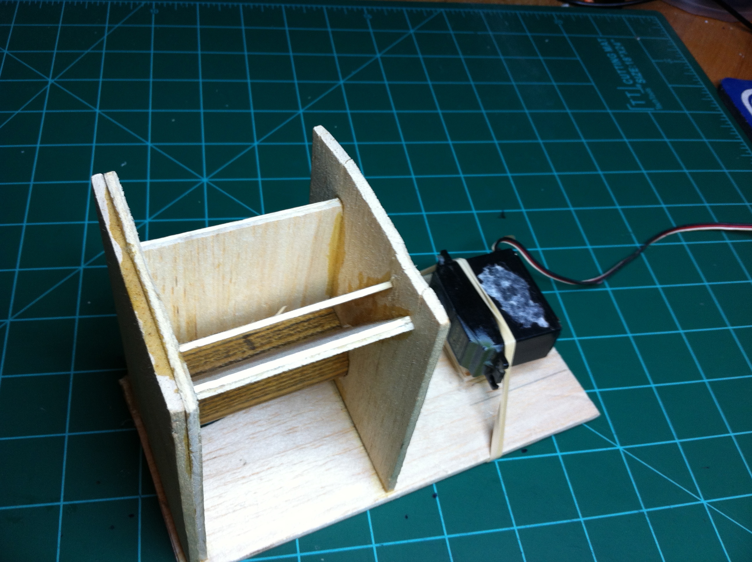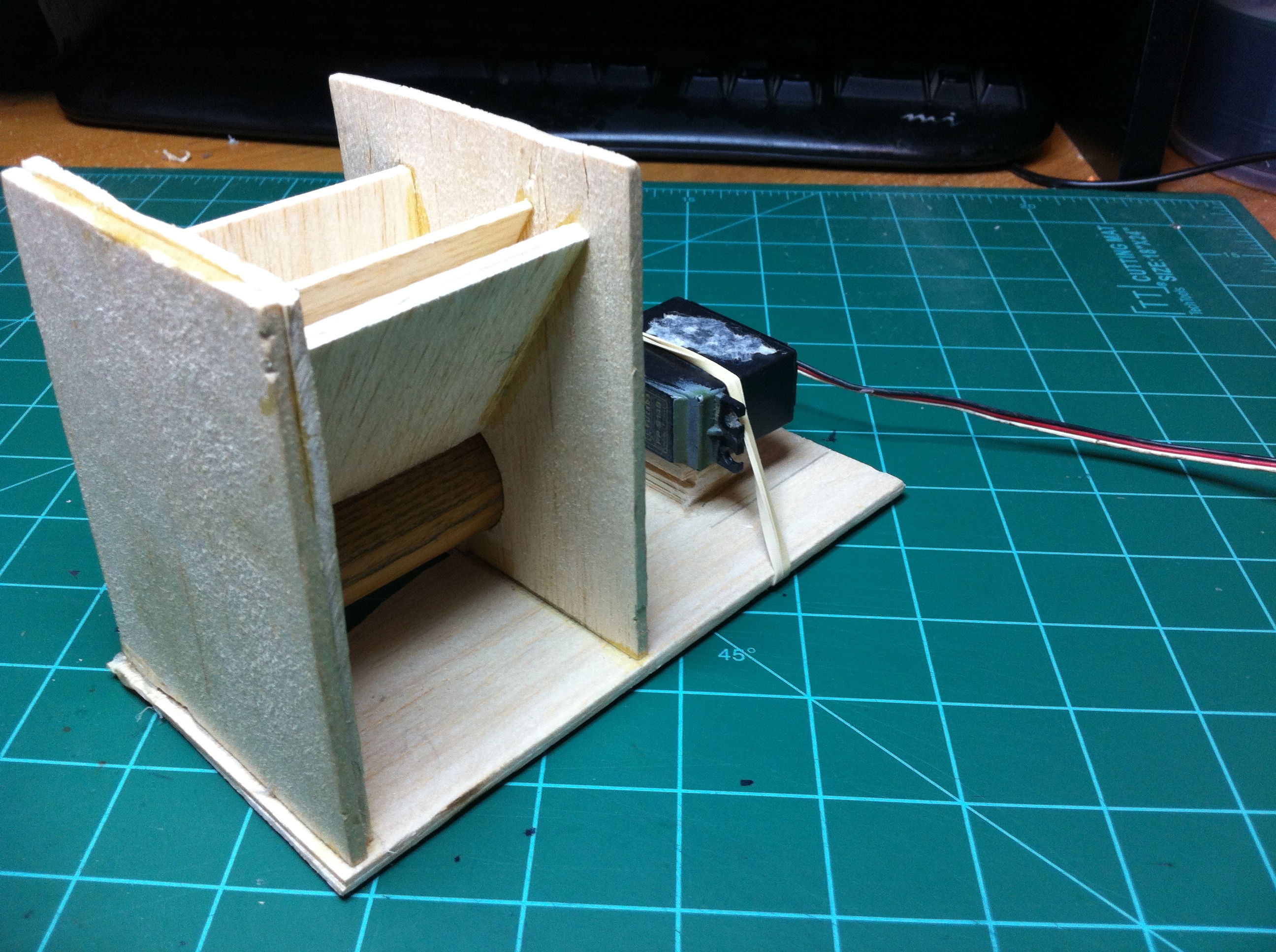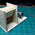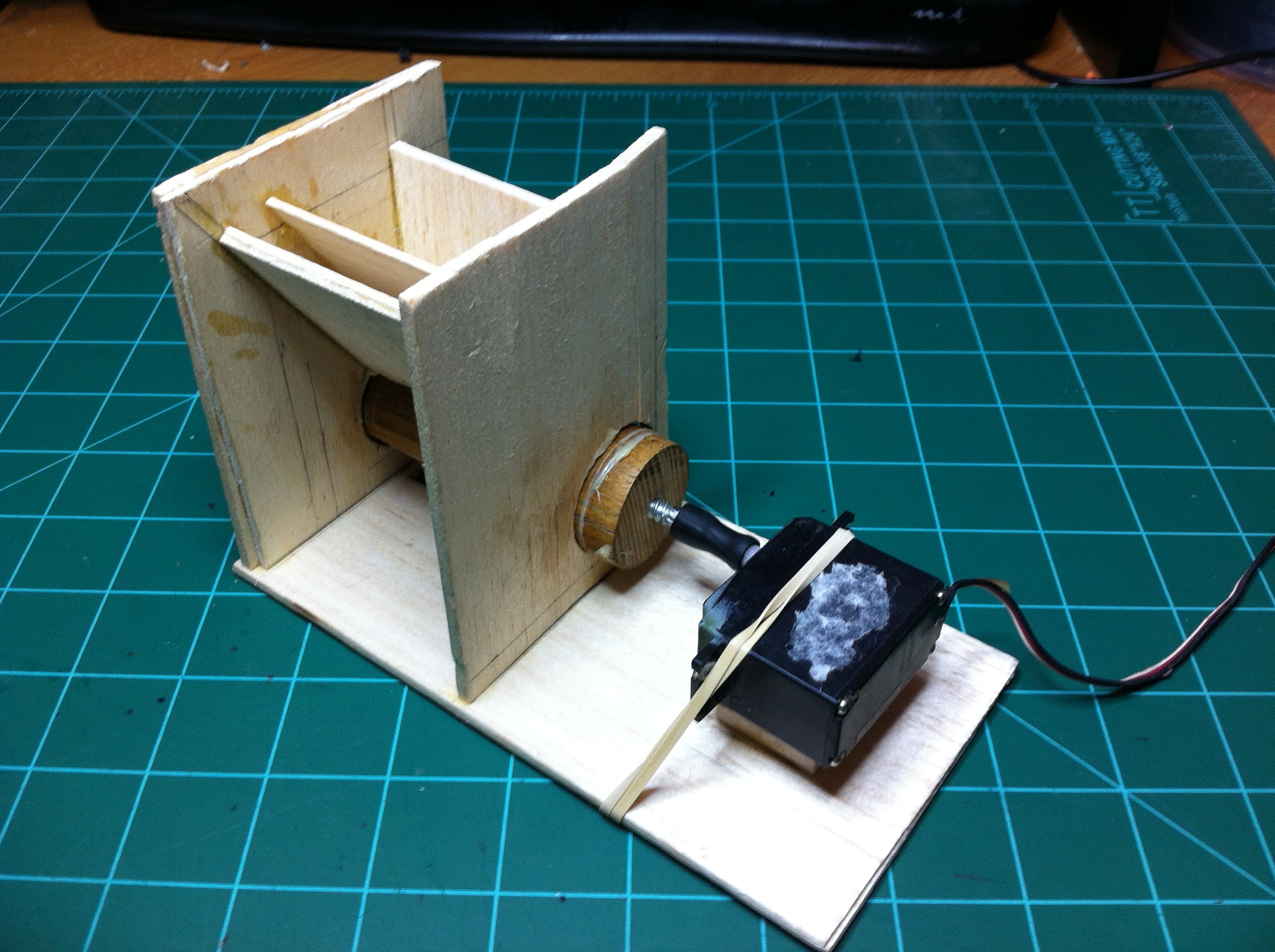 This version is made out of 1/8″ balsa wood. It’s the exact same design as the first version, it is now just made out of wood. It’s got a base, a hopper, a dowel with a groove in it, and a 360 servo. I am using a piece of 1/8″ inner diameter vacuum tubing to connect the servo to the wood screw that is in the dowel. There’s not much I can add in terms of design details because it is the same design as version one. This is more or less just an update on the project.