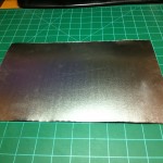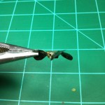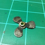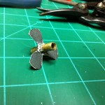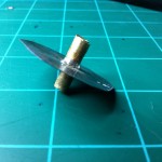 The first thing I did was cut a 3/4″ piece off of the brass tube, then I cut two 3/8″ long pieces. The 3/4″ piece will be the part that the prop will be built on, and eventually be the hub of the prop. The two 3/8″ pieces will be cut lengthwise and spread open a bit to slide over the 3/4″ piece. At this point I got some tin snips and cut off the walls of my cookie tray. I wanted a flat pice of sheet metal to work with. After I had the sides removed from the tray, I printed off the picture of propellers that the writer of the tutorial attached. I cut out the circle that encompassed the prop configuration that was colored in red. I then traced around the circle I just cut out onto the metal and then loosely cut that metal circle out. I drilled a hole in the center of the metal disk the same size as the diameter of my brass tube. I then slid the metal disk onto the 3/4″ long piece of brass tubing. After flaring out the two pieces of tubing that were 3/8″long, I slid them onto the 3/4″ piece of tube with the metal disk sandwiched in between. I then soldered all of this together. After carefully cutting out the center of the prop picture I had I used a glue-stick to stick the prop picture to the metal disk. I then cut out the propeller disk using tin snips as best I could. To clean up the edges of the prop I used a sandpaper disk and my Dremel. At this point the shaping of the prop was done, I now just needed to add some curve to the blades themselves and add some pitch to the prop.