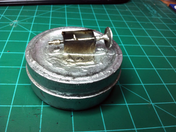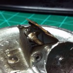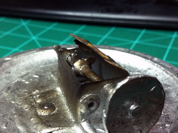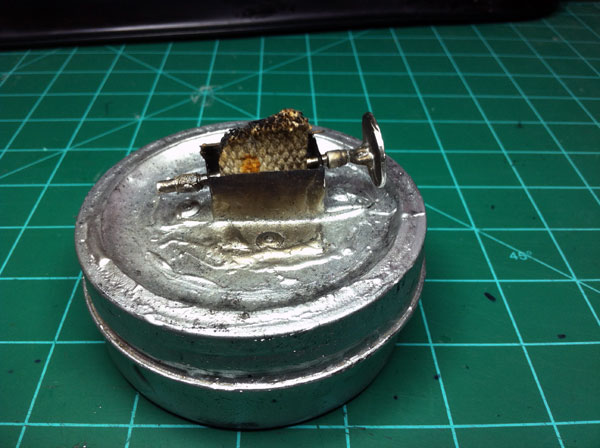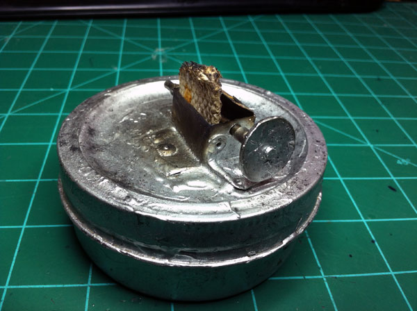 For the wick adjustment assembly I took a piece of sheet metal and made the housing for the spindle that raises and lowers the wick. After cutting a hole in the lid of the lamp I riveted the adjustment spindle housing to the lamp’s lid. I also used some JB Weld here too because I didn’t want the adjustment housing to come off, and it also covered some of the sharp corners of the sheet metal.