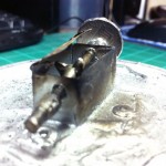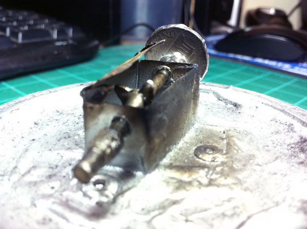 I used an 1/8″ steel rod for the actual spindle of the wick adjustment assembly. To make the ‘star’ shaped piece that grabs the wick and actually raises it up and down I used a dime. I took the dime and drilled a 1/8″ hole in the center with a drill press and then took my Dremel and cut out some of the metal to make a four point ‘star’ shape. I used JB Weld to adhere the star to the spindle. For the turn-knob I used a penny! (Yes, I used JB Weld to glue the penny to the spindle).
