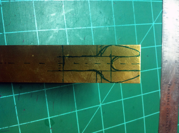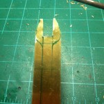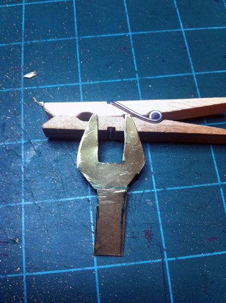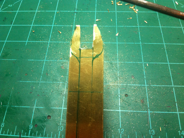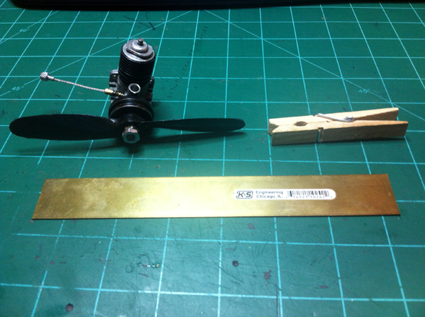 The first thing I did was go watch some YouTube videos of people starting their small Cox engines to see how the glow clip attaches and whatnot. After watching some videos, I realized that it is just a spring clamp with metal pieces that are wired to a battery. So I went and found a clothespin, a piece of brass (leftover from my boat project), and some wire. My plan is to have a fork on the bottom of the clothespin that will slide onto the engine, and piece of metal that will mount to the top of the clothespin and will touch the center post of the glow plug. So I began working on the fork first. I sketched it out on the brass and cut it out using the combination of a hand nibbler and tin snips. The nibbler was used for the center of the fork part, the tin snips were used for the outer shape. I then used multiple different files to make it nice and smooth. I then cut out a strip of brass that acts as the top piece of the clamp.
