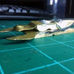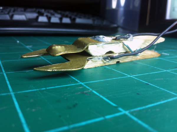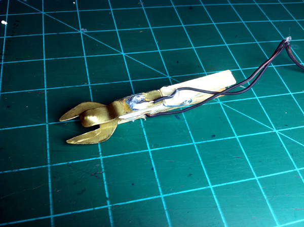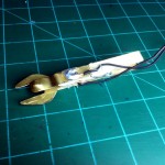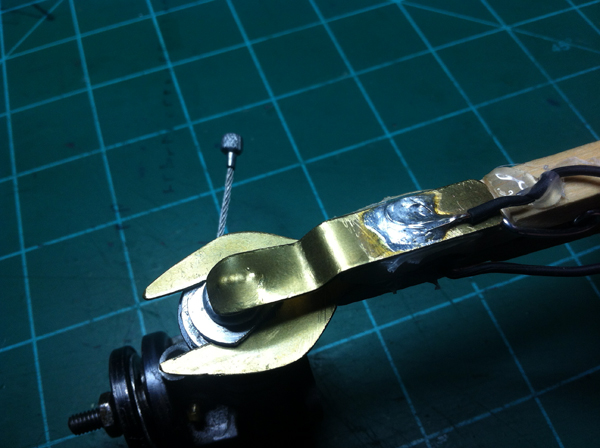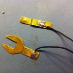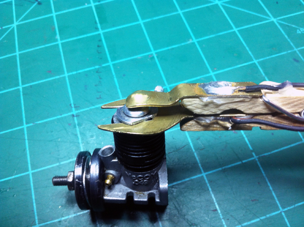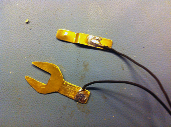 I then warmed up my soldering iron and began to solder. I soldered an 18″ wire lead to each brass piece. I still don’t know what I’m going to do with the other end of the wire. Right now I just stripped it. I don’t know if I’ll put alligator clips on, or maybe some type of other plug. This Anyway, once I soldered the wires on I tried it on my engine.