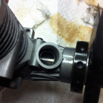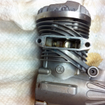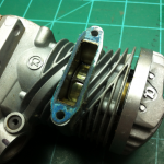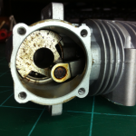 When I took the engine down off the plane, it wasn’t in really bad shape, but it sure wasn’t in good shape either. Upon first inspection the carb was gummed up to the point that it wouldn’t let the throttle lever move. Also, when I had to remove the muffler I realized the gasket was pretty much toast. I opened up the back and noticed the con-rod was gunky around where it met the crankshaft, and when I looked down the venturi I notices that the crankshaft was also covered in gummed up castor oil. So, this is where my work begins…